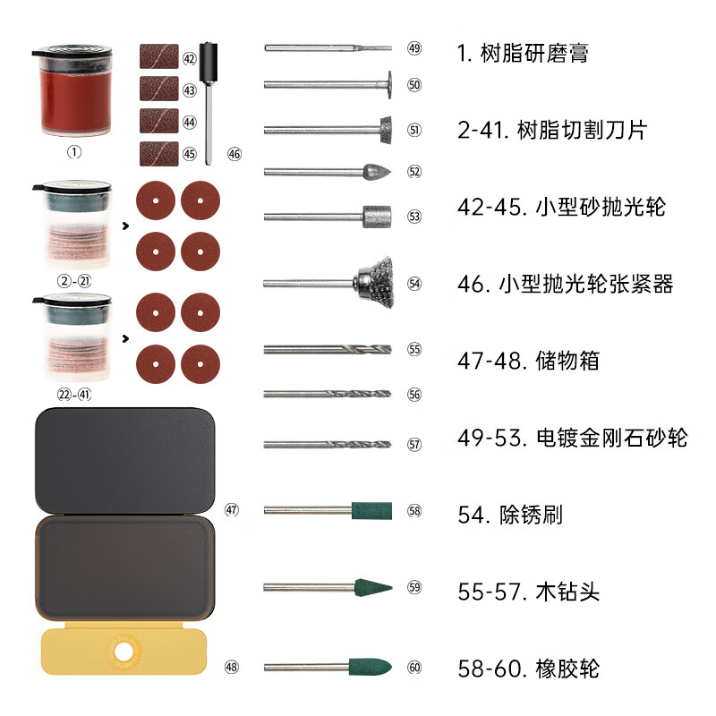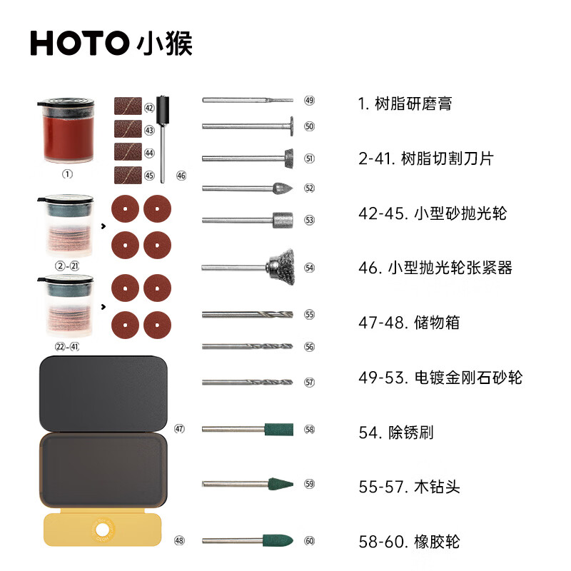 HOTO小猴锂电电磨笔配件60件套电磨机切割片磨头小型玉石雕刻金属翡翠木头钻孔研磨抛光 自营