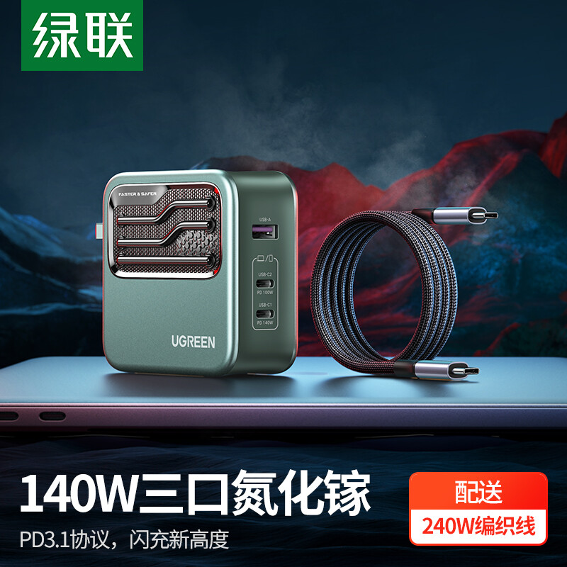 绿联 闪电湃140W氮化镓充电器GaN套装 PD快充头多口通用Macbook苹果14/13Type-C华为手机笔记本配240W数据线