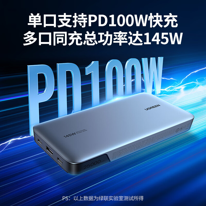 绿联 能量湃145W充电宝快充 25000毫安时大容量数显户外移动电源 通用PD100W苹果华为小米笔记本电脑手机平板