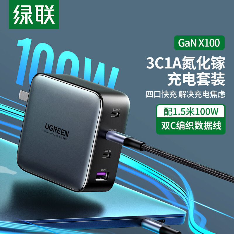 绿联闪充湃氮化镓GaN100W充电器套装通用苹果iPhone14/13华为手机Macbook多口快充头配线兼容PD65W笔记本电脑