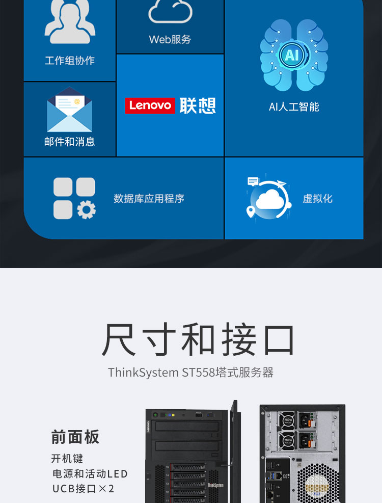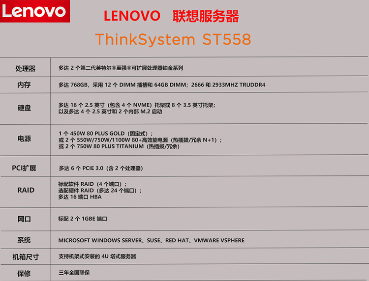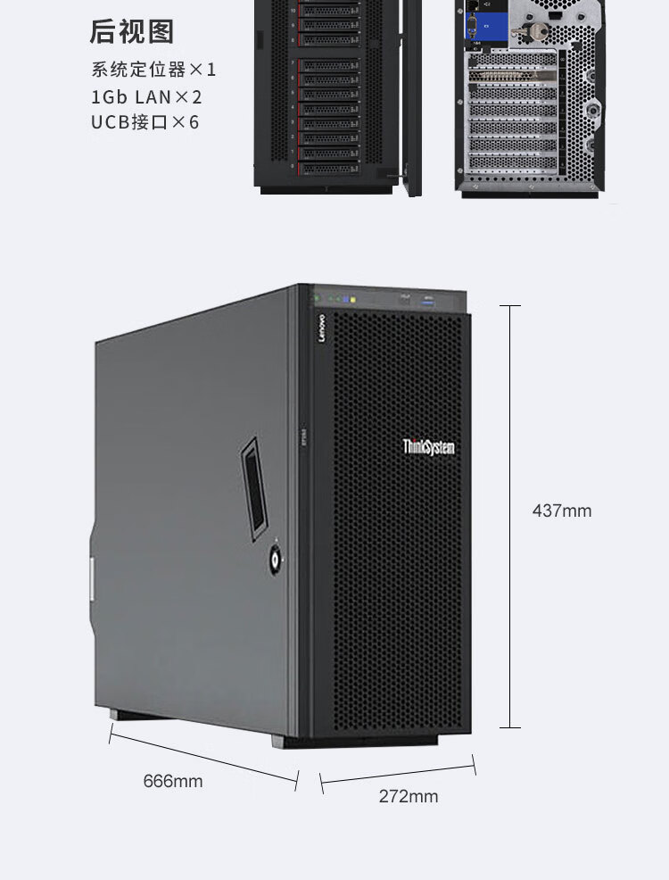 联想服务器(Lenovo) ThinkSystem ST558 塔式服务器 服务器主机 1颗银牌4210R 10核2.4G CPU 32G 4TSAS*2 双千双万网卡 自营