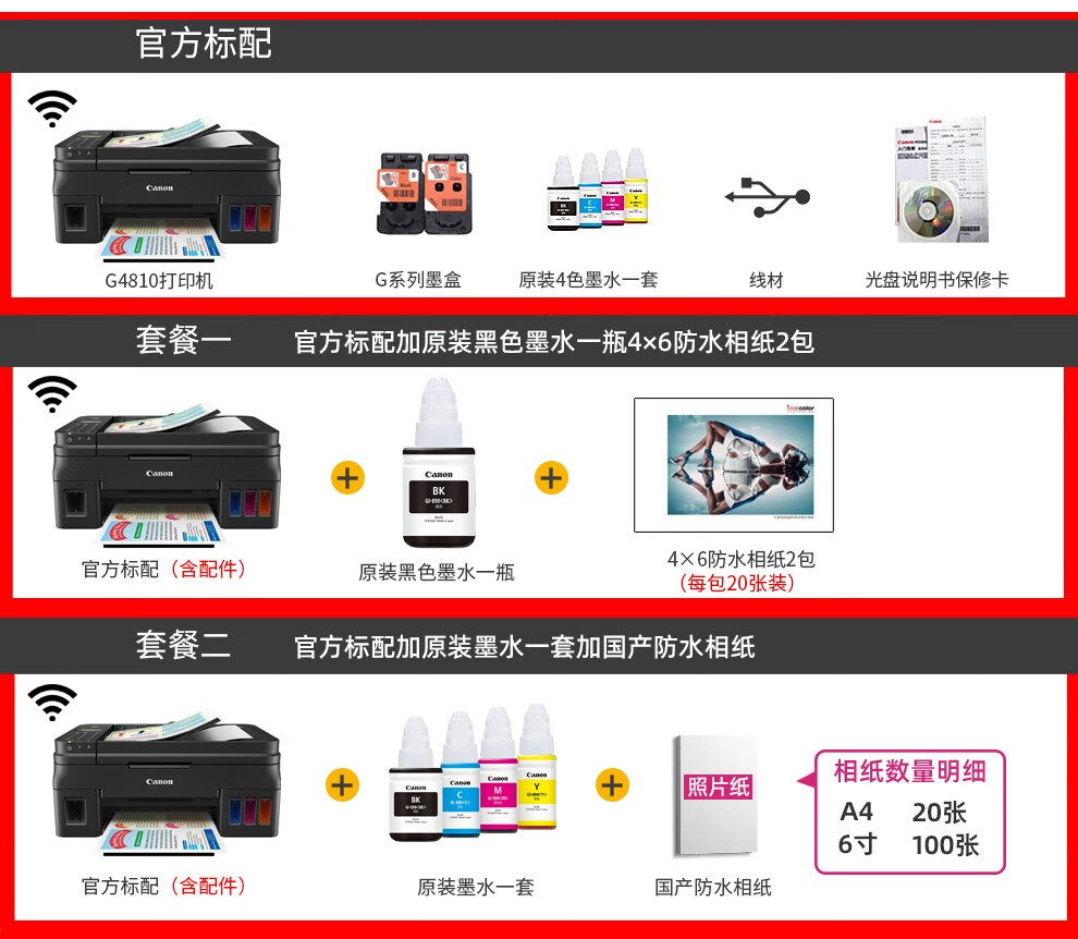 佳能(Canon) G4810无线彩色连供式喷墨家用商用办公打印机复印扫描一体机 G4810标配【自带墨水一套】 自营