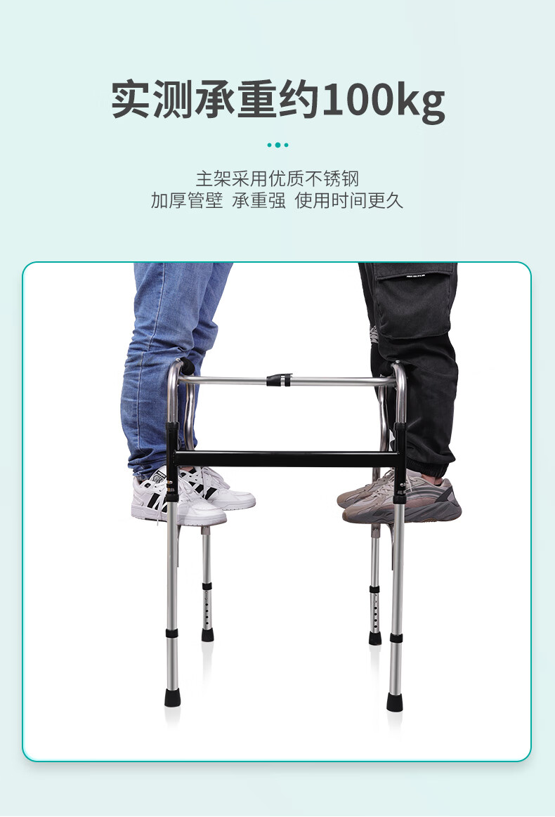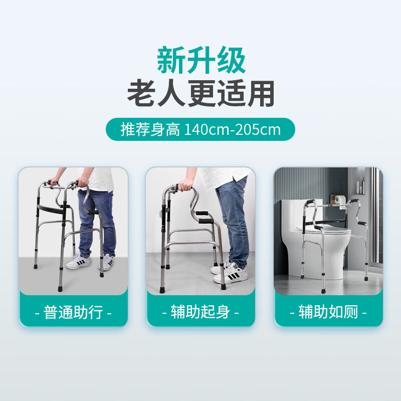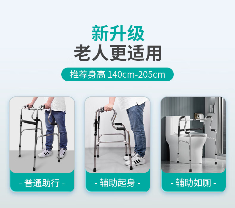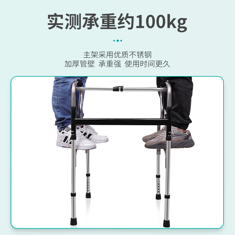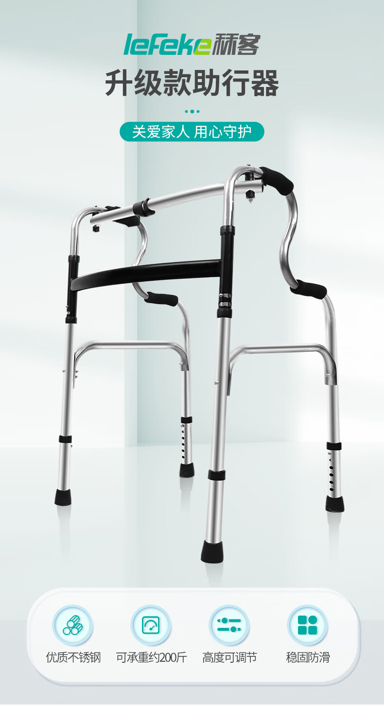 秝客*老人助行器 老人助力行走器四脚拐杖辅助行走器走路辅助器残疾人手扶助力架折叠助步带轮 不锈钢双弯 自营