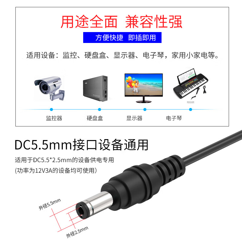 e磊 电源适配器12v3a硬盘盒显示器电源监控录像12V2.5A电源线小家电适配器5.5*2.5/2.1通用PC-1203000A 自营