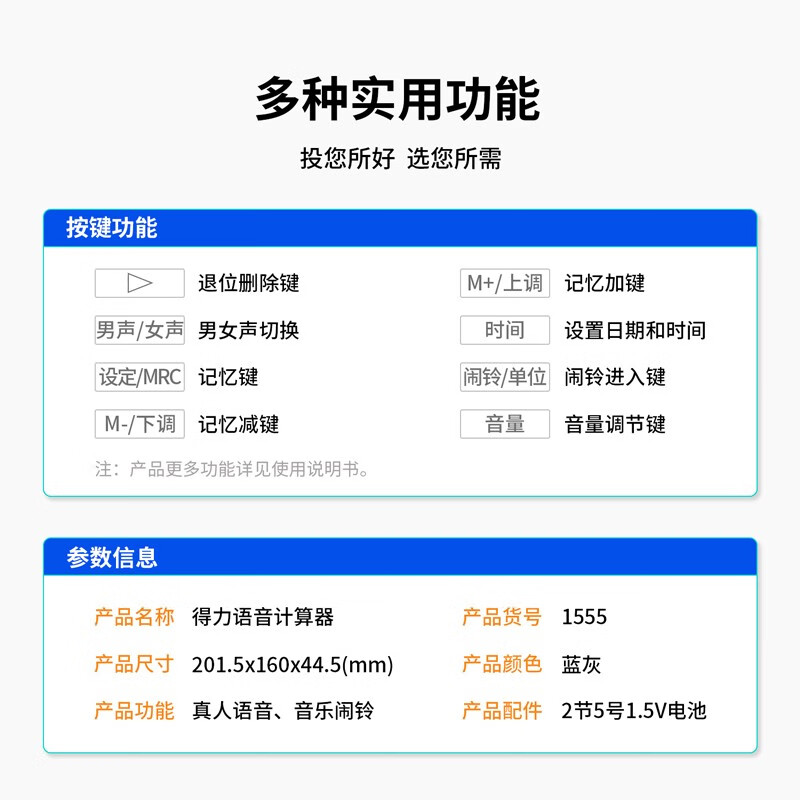 得力(deli)大屏12位语音计算器计算机 男女真声切换 电子琴功能可弹音乐 大号 1555 自营