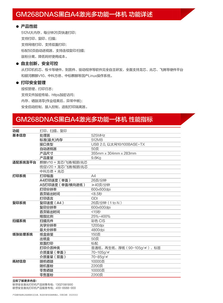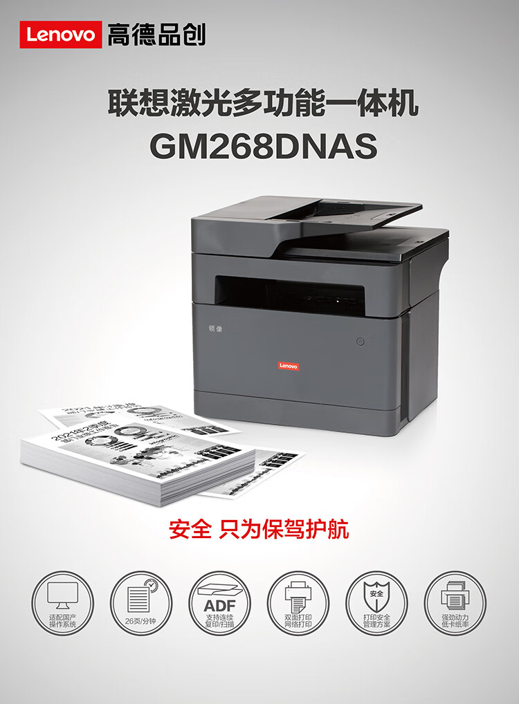 联想(Lenovo)GM268DNAS A4黑白多功能激光打印机(打印/复印/扫描)支持麒麟/统信/中科方德 自营