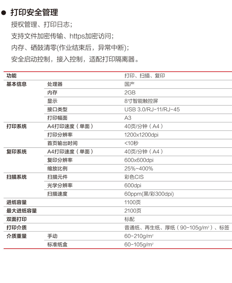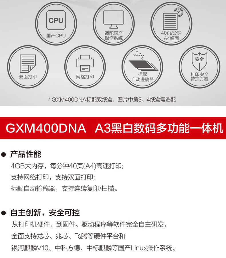 联想(Lenovo)高德品创GXM400DNAA3黑白多功能复印机/40ppm/双面网络打印/扫描国产信创目录产品 自营