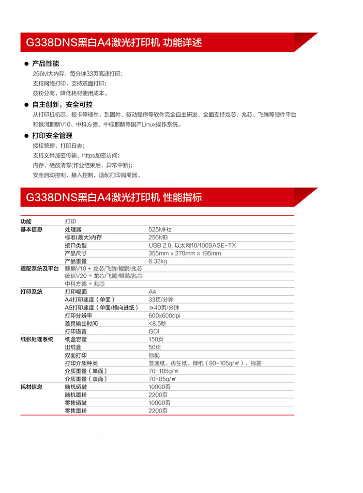 联想(Lenovo)G338DNSA4黑白激光打印机自动双面/网络打印支持麒麟/统信/中科方德(国产化) 自营