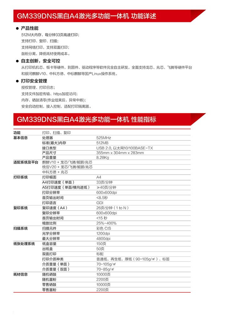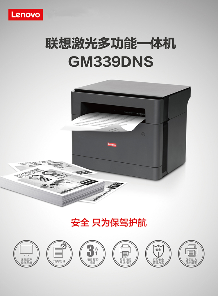 联想(Lenovo)GM339DNSA4黑白多功能激光打印机复印/扫描33ppm512MB双面打印网络打印(国产化) 自营