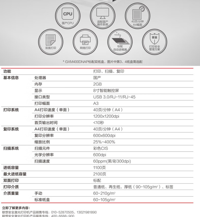 联想(Lenovo)GXM400DNAPA3黑白多功能(打印/复印/扫描)40ppm/双面打印/网络打印(国产化) 自营