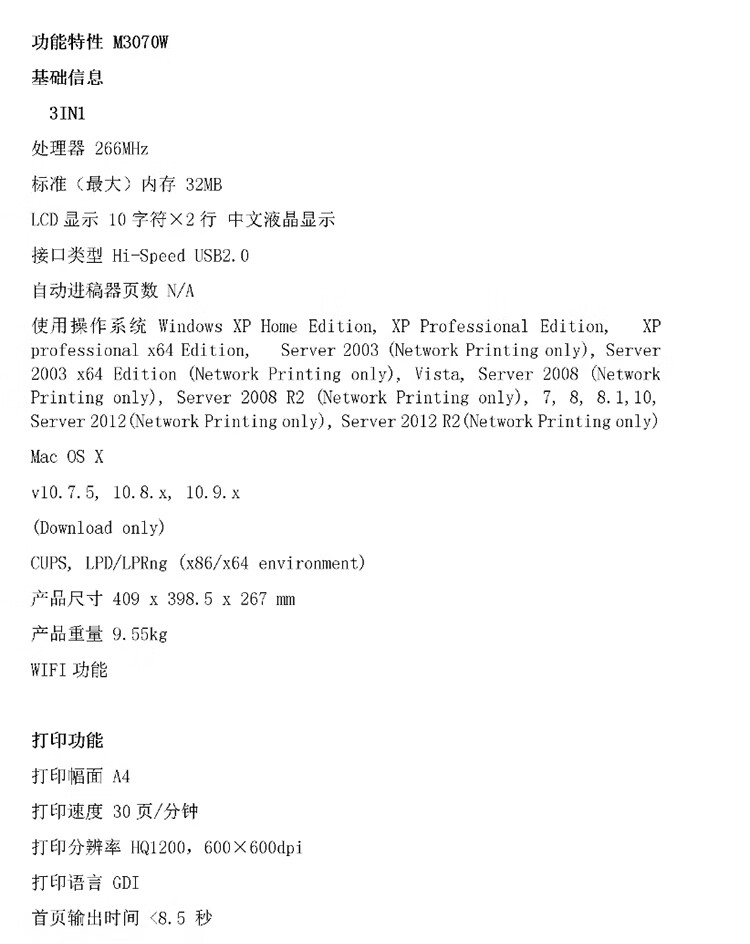 联想(Lenovo)至像M3070WA4黑白激光多功能一体机打印复印扫描鼓粉分离 自营