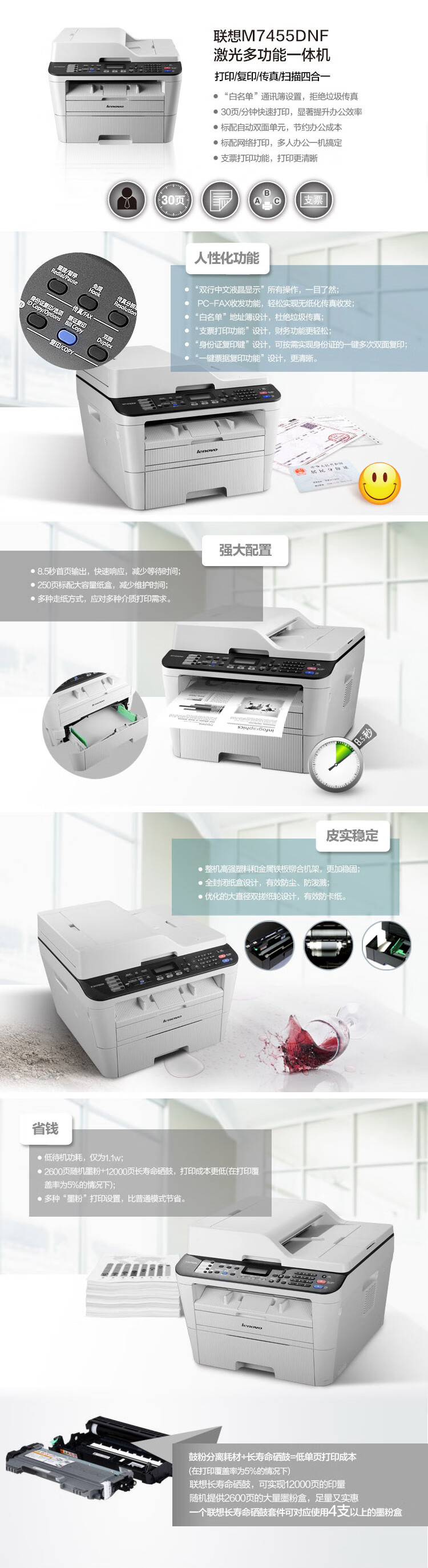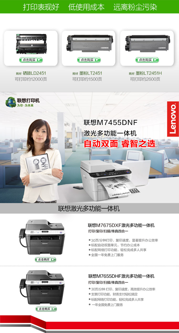 联想(Lenovo)M7455DNFA4黑白激光多功能一体机自动双面有线网络打印复印扫描传真 自营